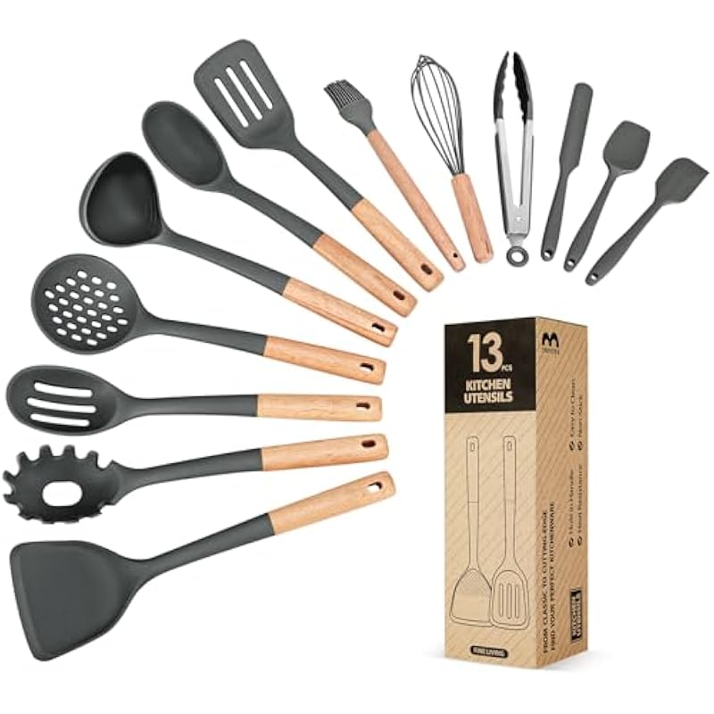 Kitchen Utensils Set, 13PCS Silicone Cooking Utensils, Heat Resistant Kitchen Utensil Spatula Set for Nonstick Cookware, Wooden Handles Kitchen Gadgets Tools Set