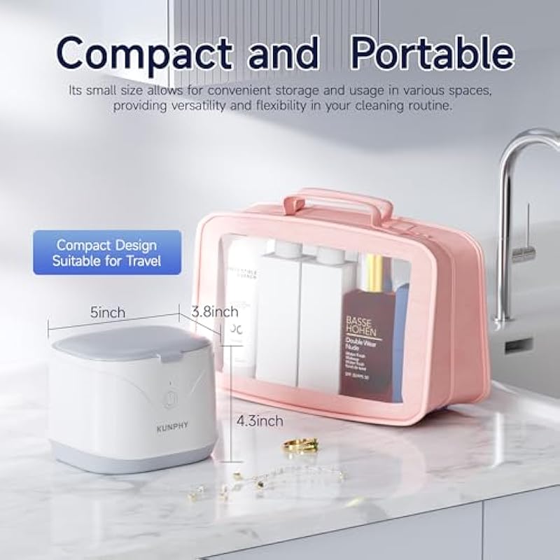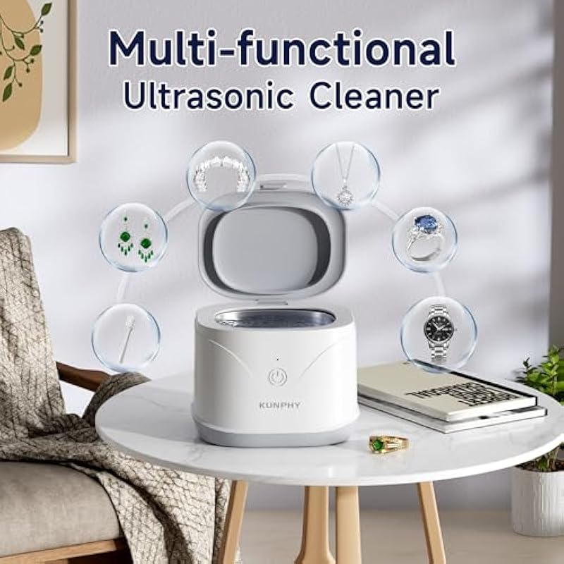 KUNPHY Ultrasonic Retainer Cleaner with 50ml Solution,46KHz Professional Jewelry Cleaner, Soinc Dentures Machine for Mouth Guard, Braces, Aligner, Dental Appliances 7.5Oz (White)