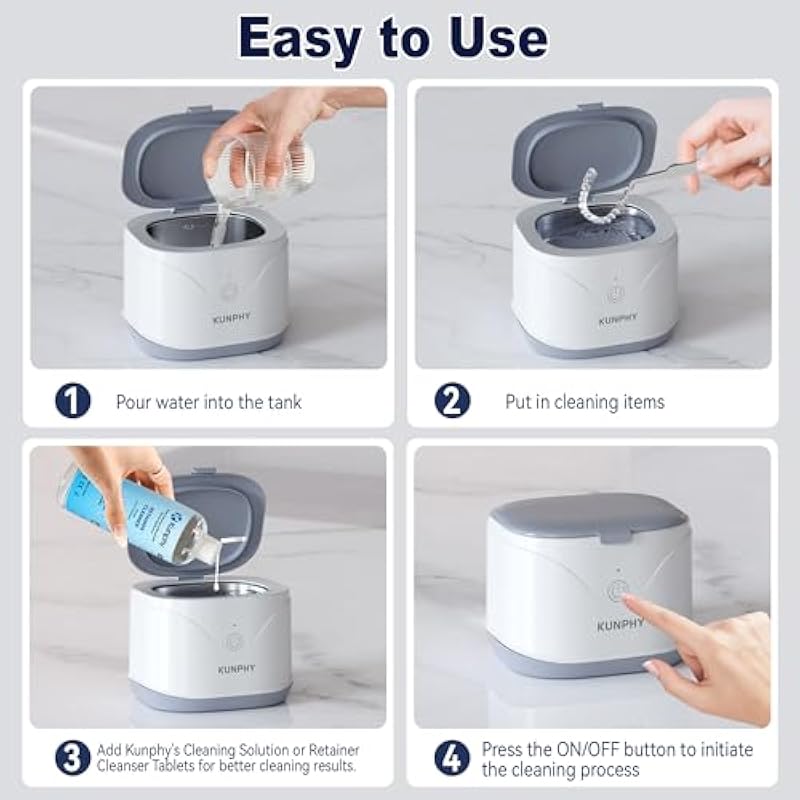 - Quick & Easy to Use: Just fill the dental machine with water and KUNPHY retainer solution, pop in your dental appliance, and press start. In 5 minutes, your device comes out sparkling clean and fresh—no hassle!
