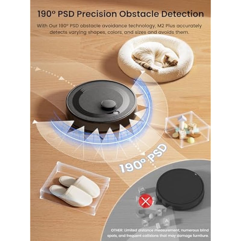 - 【Precision Detection & Avoidance & Pet-Friendly Design】The laser robot vacuum cleaner features 190° wide detection angle, powered by advanced PSD technology. It accurately detects and avoids objects as close as 1.6 inches away, ensuring better collision prevention and maintaining cleanliness, even in the dark. Designed specifically for pet owners, the effectively removes pet hair and prevents getting stuck