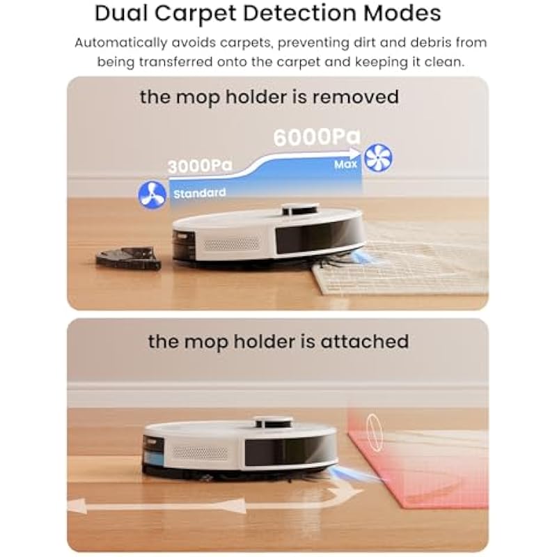 - 🔄【Carpet Detection & Auto Boost】The M2 Plus robotic vacuum features advanced carpet detection, allowing it to expertly avoid carpets when the mop holder is attached, keeping them dry and spotless. When thes mop holder is removed, it automatically boosts suction to maximum for a deep, efficient clean. This effortless transition ensures comprehensive cleaning across all surfaces, making the M2 Plus the perfect choice for homes with diverse flooring.