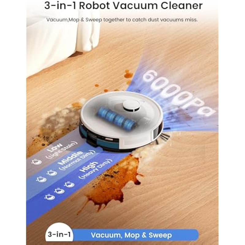 - 💪【6000Pa Super Strong Suction】Robot Vacuum with 6000Pa Suction features a roller brush – Easily picks up debris, hair, and dust from floors and carpets. The consists of a 250ml dustbin and a 300ml water tank. Features app-controlled 3-level water flow for customized cleaning by room, adapting to floor types and dirt levels for a deep, hassle-free clean. Perfect for effortless, spotless floors.