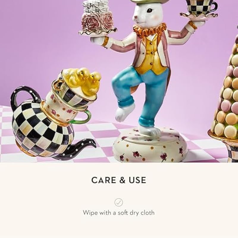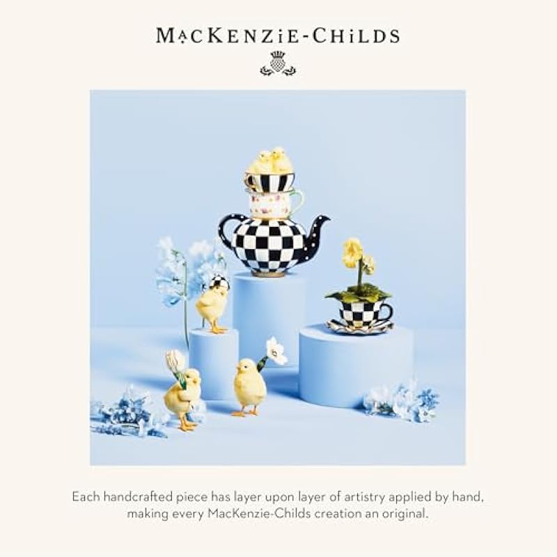 - ELEGANT SPRING DECOR: Made of hand-painted resin, this decorative piece features a MacKenzie-Childs Courtly Check teapot topped with 2 teacups in striped and dotted floral patterns. It has gold-foil detailing and 2 cute baby chicks on top.