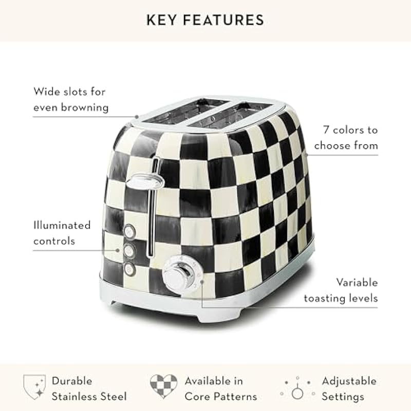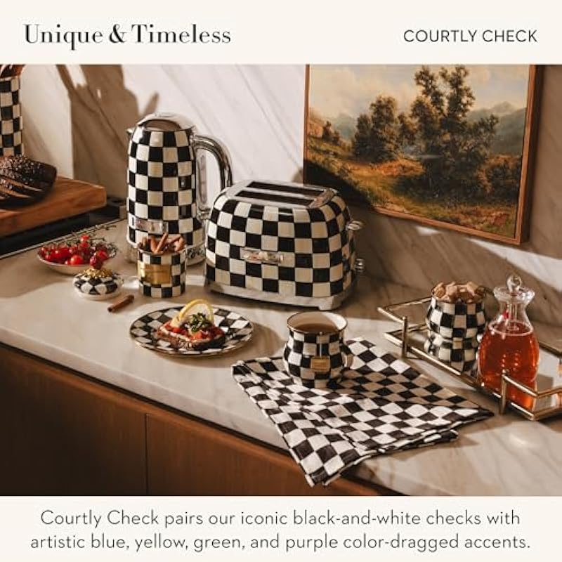 - ELEGANT KITCHEN ESSENTIALS: Our Courtly Check Electric Kettle and 2-Slice Toaster Bundle includes kitchen appliances covered in color-dragged black-and-white checks. The iconic checkered pattern pairs with retro styling to create uniquely charming pieces.