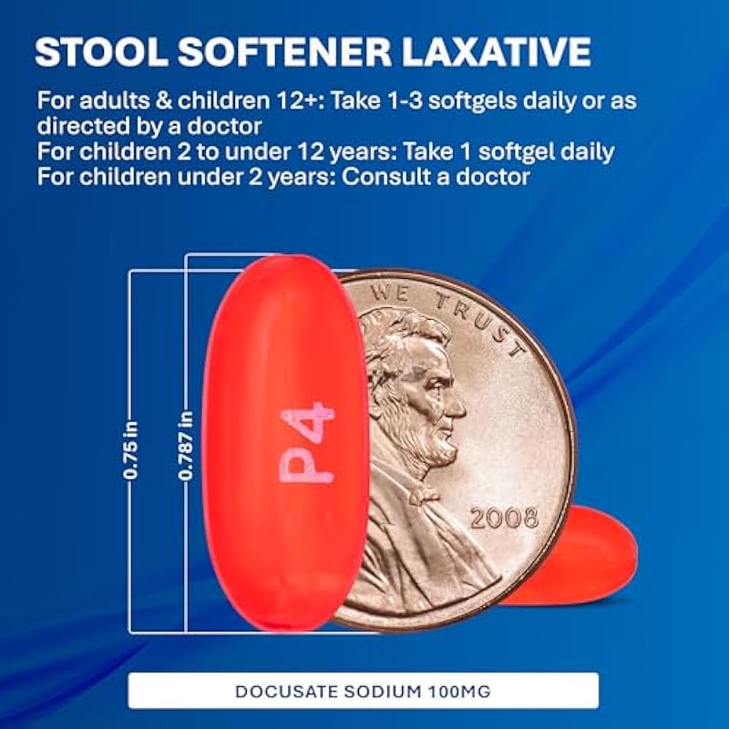 - STOOL SOFTENER LAXATIVE – Docusate Sodium 100 mg softgels help ease occasional constipation by gently softening dry, hard stools, making bowel movements more comfortable and natural within 12 to 72 hours.