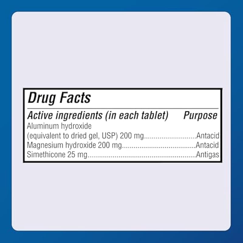 - ACTIVE INGREDIENTS: Each tablet contains 200 mg of aluminum hydroxide (equivalent to dried gel, USP) and 200 mg of magnesium hydroxide, two antacids. It also has 25 mg of simethicone, an antigas ingredient.
