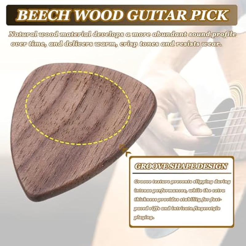 - The wood guitar picks are designed for musicians seeking superior control, the innovative groove texture prevents slipping during intense performances, while the thickness provides stability for fast-paced riffs and intricate fingerstyle playing. Natural wood material develops a more abundant sound profile over time, and delivers warm, crisp tones and resists wear.