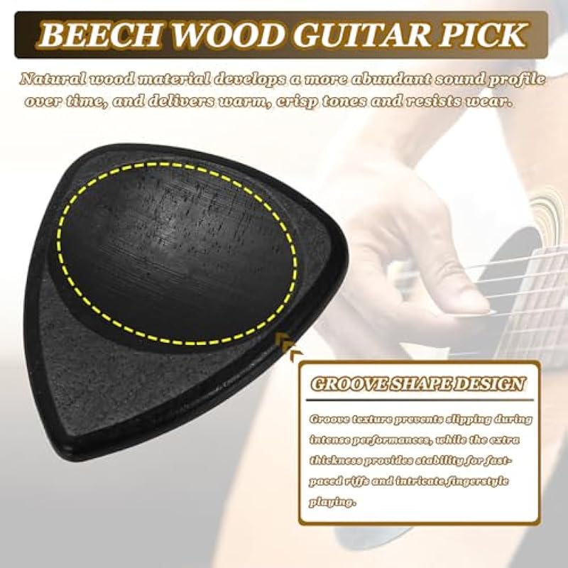- The wood guitar picks are designed for musicians seeking superior control, the innovative groove texture prevents slipping during intense performances, while the extra thickness provides stability for fast-paced riffs and intricate fingerstyle playing. Natural wood material develops a more abundant sound profile over time, and delivers warm, crisp tones and resists wear.