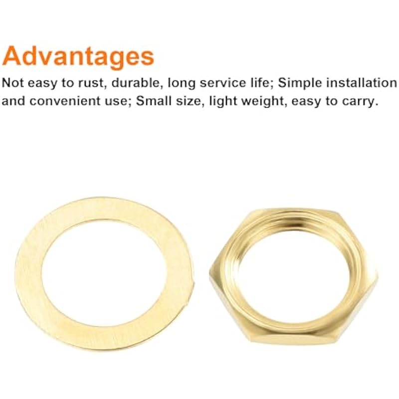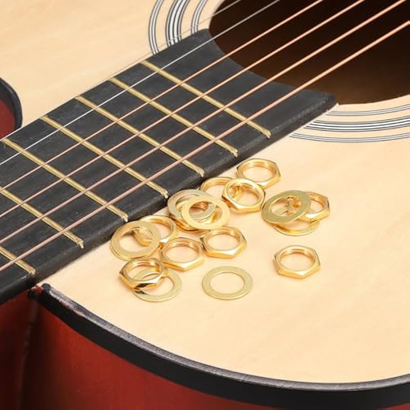 - Guitar nut, is in size of : 12mm x 8.9mm x 2mm/0.47-inch x 0.35-inch x 0.08-inch(Hex opposite side width*Inner dia*Thickness); Guitar washers, is in size of : 9.5mm x 14mm/0.37-inch x 0.55-inch(Inner Dia*Outer Dia); Color: Gold; Material: Brass Nut, Iron Washer; In the package of: 4 Set x Guitar Nuts and Washers