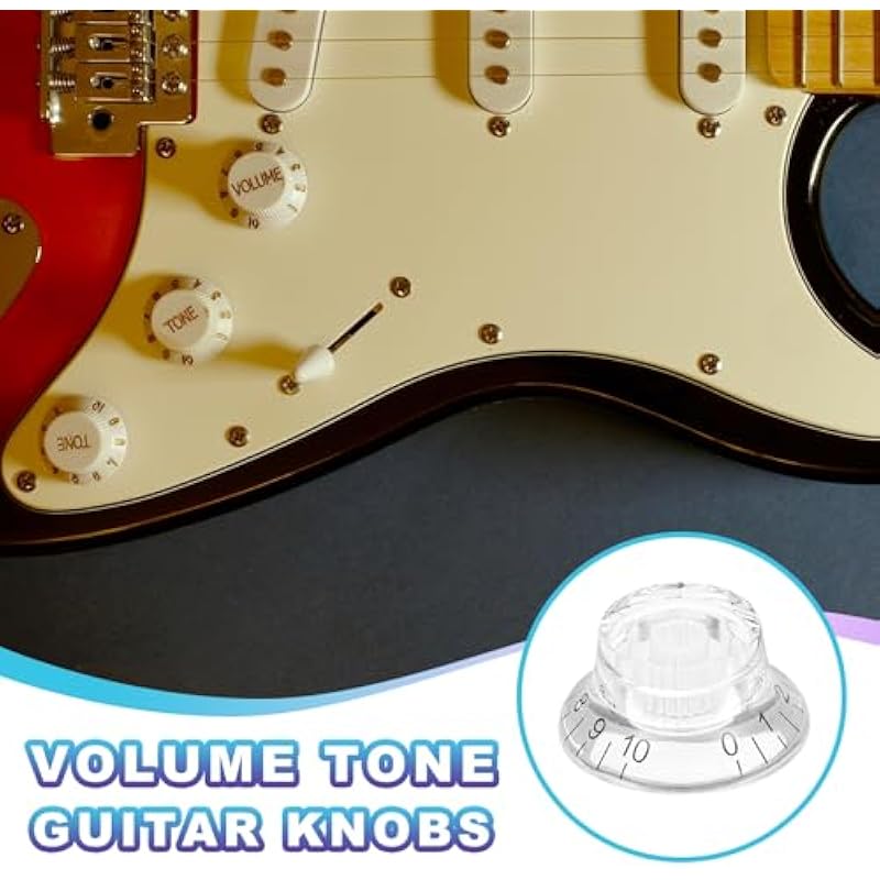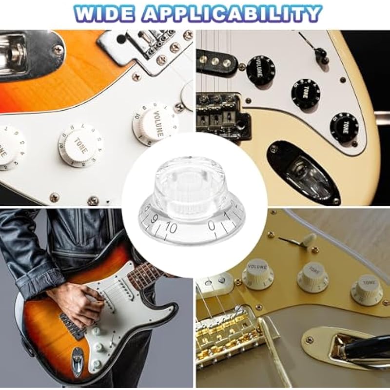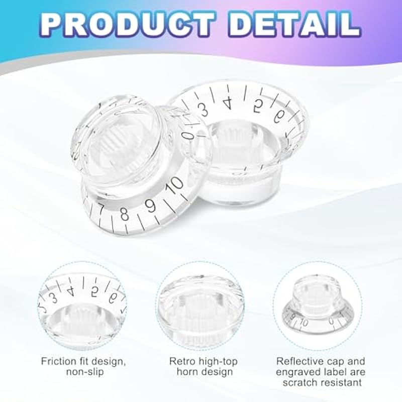 - The guitar knob is made of good materials, durable and scratch-resistant, with a long service life. The reflective cap and engraved label add visual effects on stage. Easy installation, no screws or tools are required to complete the setup; the friction fit design provides precise control and ensures non-slip during music performances. The retro high-top bell design and reflective cap perfectly combine retro style with precise speed/volume adjustment.