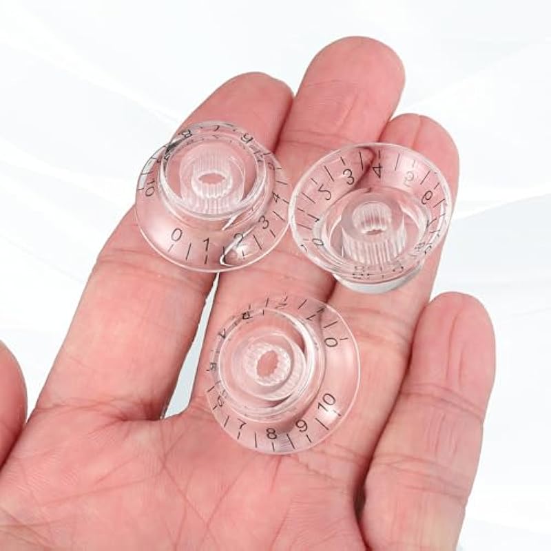 - Electric Guitar Knobs, Color: Clear Black, Material: Acrylic + Plastic, Size: 26x17x12.5mm/1.02×0.67×0.5 inch(IDxODxH), In the package: 4 x Guitar Knobs