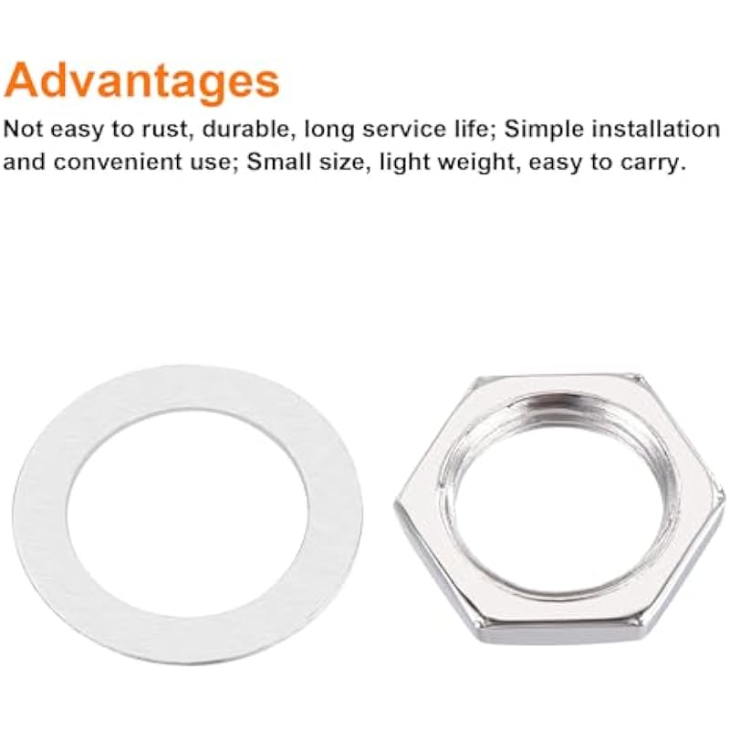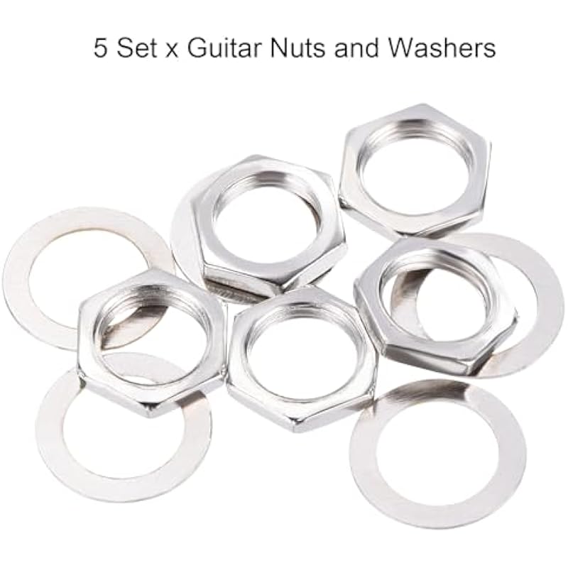 - Guitar nut, is in size of : 12mm x 8.3mm x 2.4mm/0.47-inch x 0.33-inch x 0.09-inch(Hex opposite side width*Inner dia*Thickness); Guitar washers, is in size of : 9.5mm x 14mm/0.37-inch x 0.55-inch(Inner Dia*Outer Dia); Color: Silver; Material: Brass Nut, Iron Washer; In the package of: 5 Set x Guitar Nuts and Washers