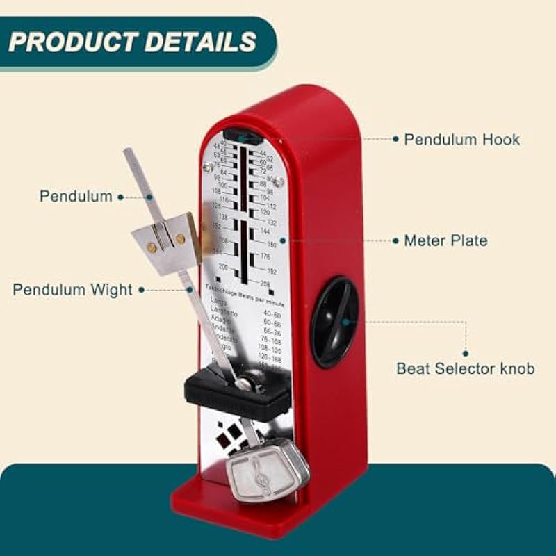 - Mini mechanical metronome size: 110mm x 54mm x 37mm/4.3inch x 2.1inch/1.5inch(LxWxH),Beat Range: 40-208 beat per minute,Color:Red,In the package of:1x piano metronome