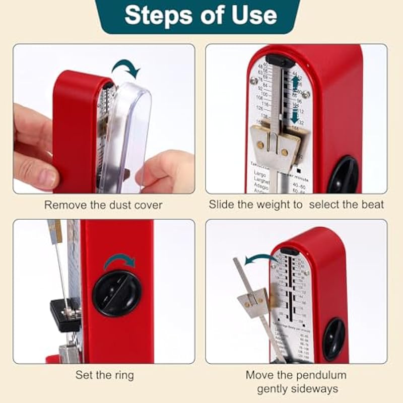 - The instrument metronome is easy to use and does not take up too much time. Just pull the cover, adjust the beat and rhythm, and start the pendulum.