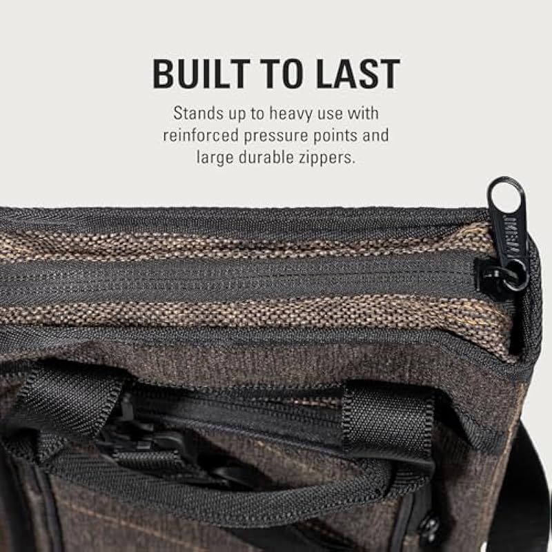 - OF NOTE: the bag is made with heavyweight cotton tweed exterior and a PVC backing to give the bag more shape; this thick, low-stretch, durable material is finished with suede leather and stitched accents; heavy-duty zippers glide easily