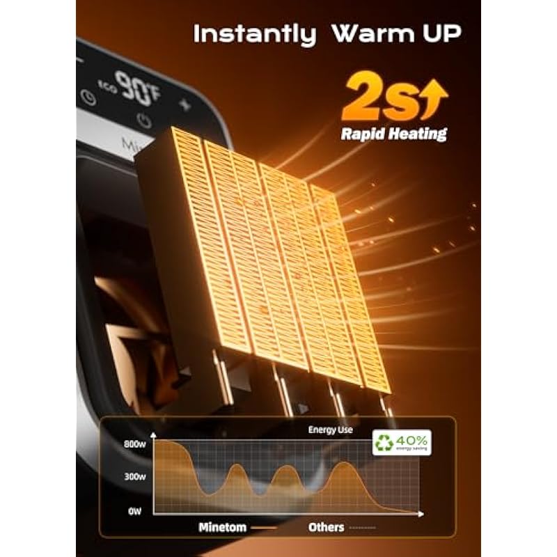 - 𝟐𝐬 𝐈𝐧𝐬𝐭𝐚𝐧𝐭 & 𝐒𝐢𝐥𝐞𝐧𝐭 𝐏𝐓𝐂 𝐇𝐞𝐚𝐭𝐢𝐧𝐠: Powered by upgraded PTC Technology, Minetom space heater could heat up efficiently in 2s around 125sq.ft. With the design of the upgraded fan, the plug in heater for indoor use delivers silent warmth(under 40 dB), which ensures a better sleep and working environment.