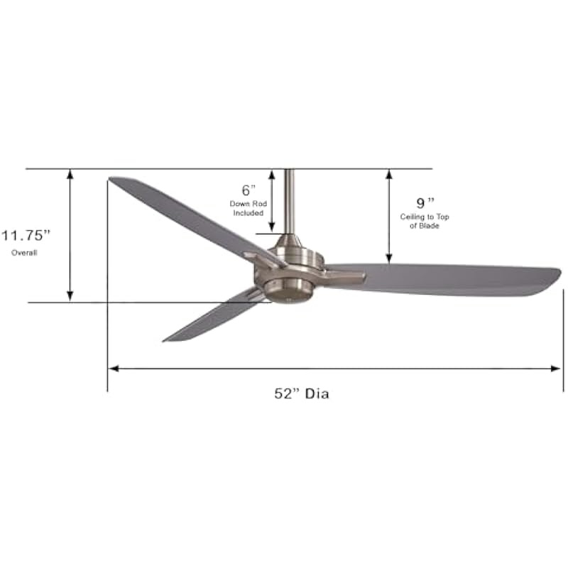 - DIMENSIONS: Measures 10.75” from the ceiling to the lowest point of the fan with the included 6″ Downrod. This Contemporary Ceiling Fan has a blade sweep diameter of 52” with 14° Blade Pitch