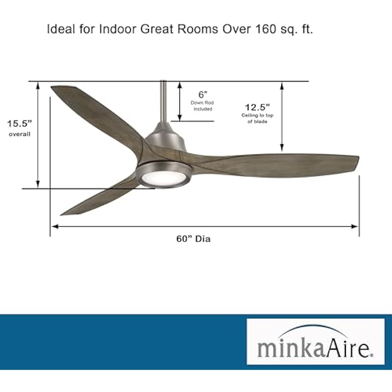 - DIMENSIONS: Measures 15.5” from the ceiling to the lowest point of the fan with the included 6″ downrod. This Contemporary Ceiling Fan has a blade sweep diameter of 60” with 14° Blade Pitch