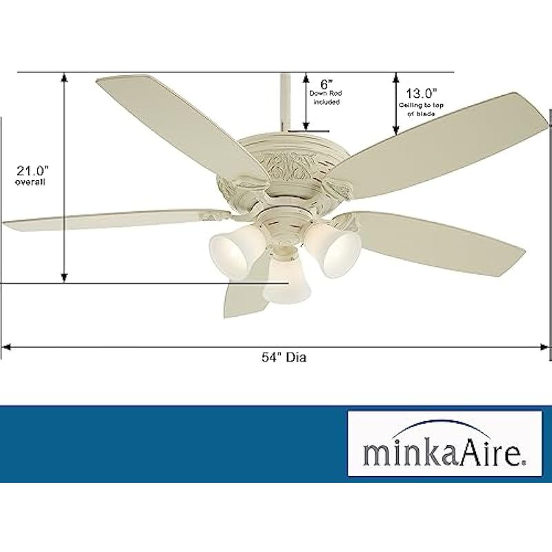 - DIMENSIONS: Measures 21.0” from the ceiling to the lowest point of the fan. This Unique Style Ceiling Fan has a blade sweep diameter of 54” with variable Blade Pitch