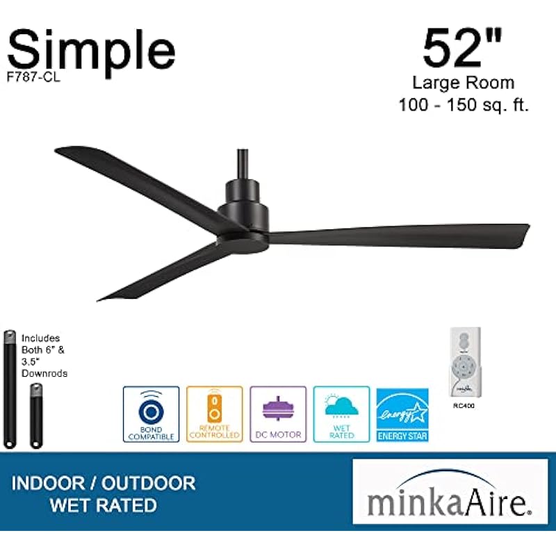 MINKA-AIRE F787-CL Simple 52″ Outdoor Low Profile 3 Blade Ceiling Fan with DC Motor in Coal Finish with Included 3″ Downrod