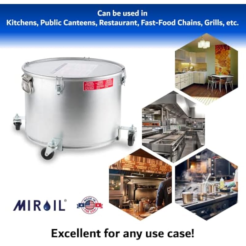 - SAFE, SPILL RESISTANT STORAGE & TRANSPORT FOR COOKING OIL – Designed for commercial kitchens, restaurants, and food trucks, the MirOil 60LC Oil Utility Pail offers a reliable solution for safely disposing of and storing up to 55 lbs. (7 gallons) of used cooking oil. Built from heavy-duty materials for long-lasting durability, it accommodates a wide range of oils including peanut oil, vegetable oil, and other fryer oils. The included tight-sealing lid locks in odors and prevents leaks, ensuring clean, secure storage and transport.