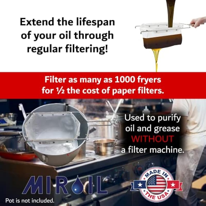 - EFFORTLESS FILTRATION: Simply place the sturdy frame and bag over your container for hands-free filtering of hot or cold oil. This durable fry oil filter is ideal for busy kitchens, including as a commercial deep fryer filter. Rinses clean with water.