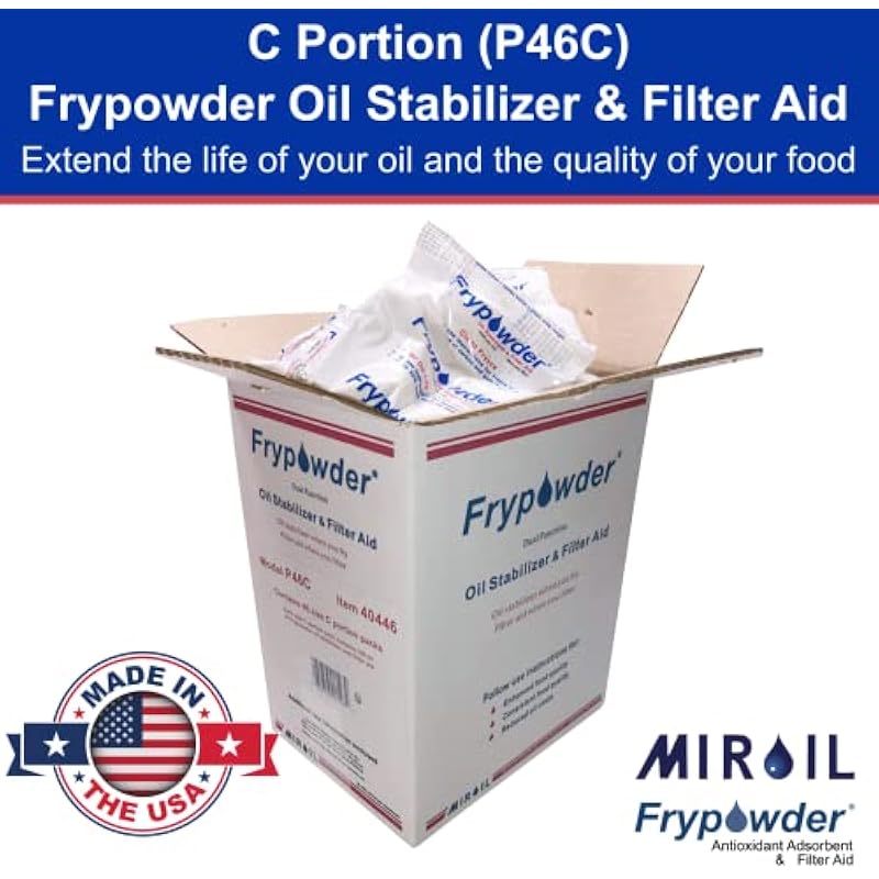 - EXTEND FRYING OIL LIFE & ENHANCE FILTRATION EFFICIENCY – This carton includes 46 individual C-size (160ml) portion packs of MirOil Fry Powder, designed to optimize deep fryer oil filtration and extend the lifespan of frying oil. This oil stabilizer helps maintain oil freshness, improves food quality, and reduces oil consumption, making it ideal for commercial kitchens, restaurants, food trucks, and catering businesses. Use it with deep fryers, oil fryers, and commercial frying systems to minimize waste, lower costs.