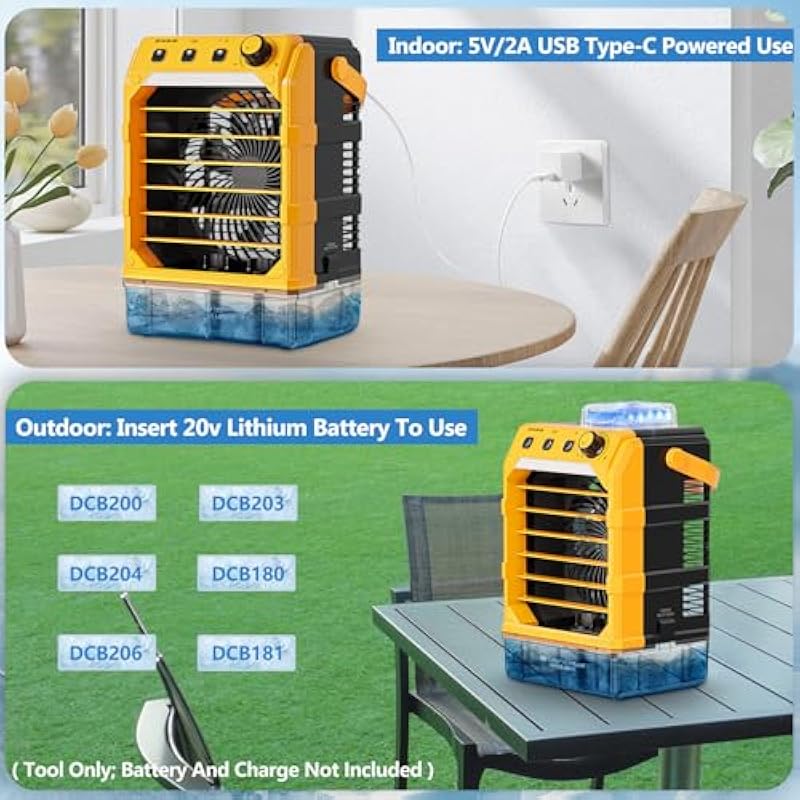 - Camping Fan Battery Powered: Uniqwamo battery powered fan compatible for Dewalt 20v Battery(battery not included), portable fan with mist work for DCB200, DCB203, DCB204, DCB207, DCB206, DCB181, DCB182, great for outdoor activities, ensuring cool comfort wherever you go