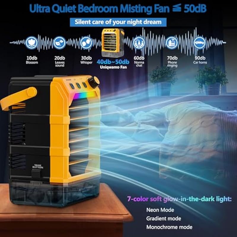 - 6-In-1 Portable Fan: Portable misting fan combines the functions of a fan, ice fan, water fans for cooling outside, misting, humidifier, and night light, which can immediately make you feel cooling and increase humidity for a dual cooling effect