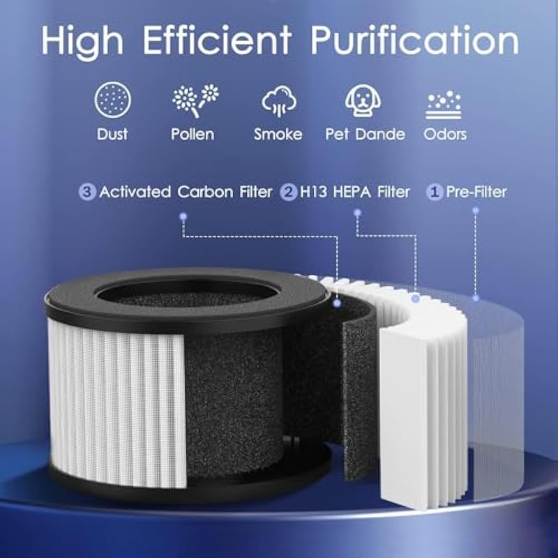 - 15-dB LOW-NOISE OPERATION: This small air purifier operates at only 15 dB in sleep mode. The on-screen button light will go out in sleep mode after 10s no operation, allowing you to enjoy a peaceful rest. In addition, you can also switch on the night ambient light and choose a timer of 2/4/6/8 hours.