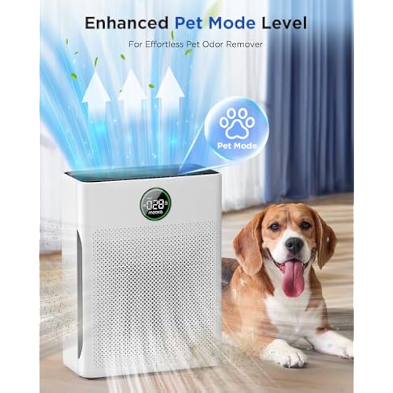 - AIR PURIFIER DESIGNED FOR PET LOVERS: This home pet air purifier is innovatively designed with the “Pet Mode”. In this mode the increased purification effect helps capture pet hair and pee smell in the air faster, significantly improving indoor air quality and helping you and your Families enjoy cleaner air. You can also water clean the washable pre-filter to extend the life of the 4-stage filtration system and dry the shade before using the air purifiers for home pets again.