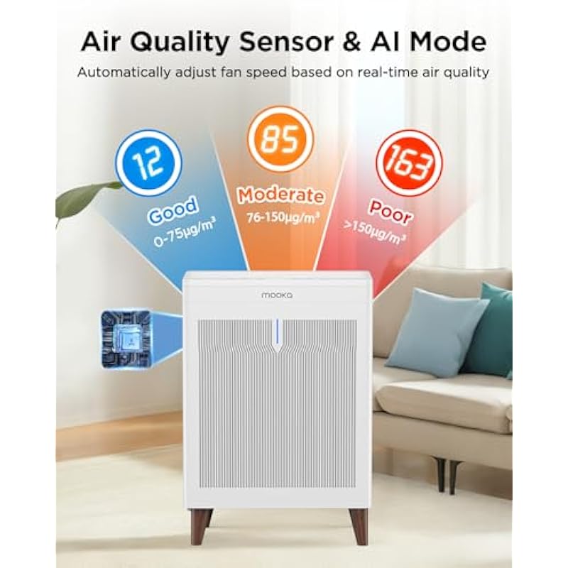 - 【Smart PM2.5 Air Quality Sensor & AI Mode】The air purifiers for bedroom features a built-in PM2.5 sensor with light color indication and numerical value, letting you monitor indoor air quality at a glance. AI mode of air purifiers for home pets automatically adjust fan speed based on real-time air quality,which can ensure a pure living environment for you. (The sensor may need some time to assess air quality accurately when the machine is turned on)
