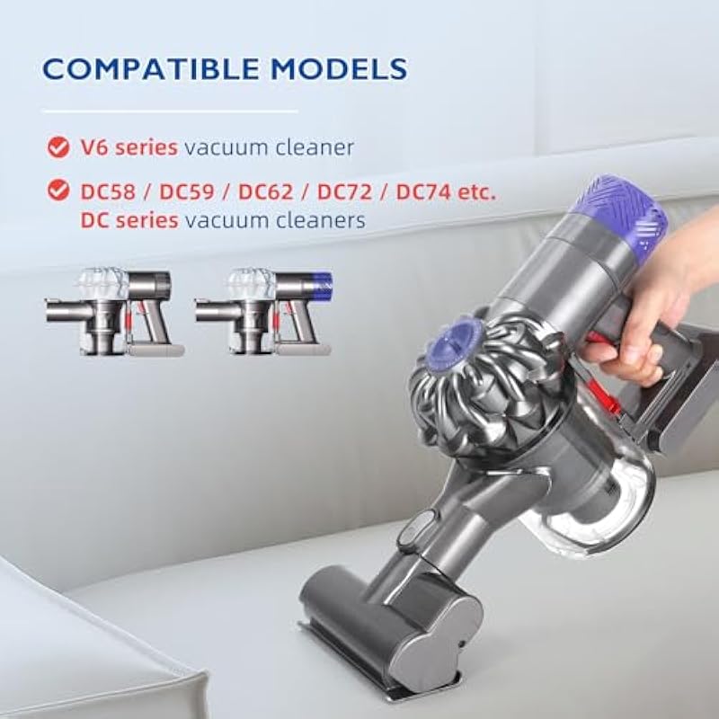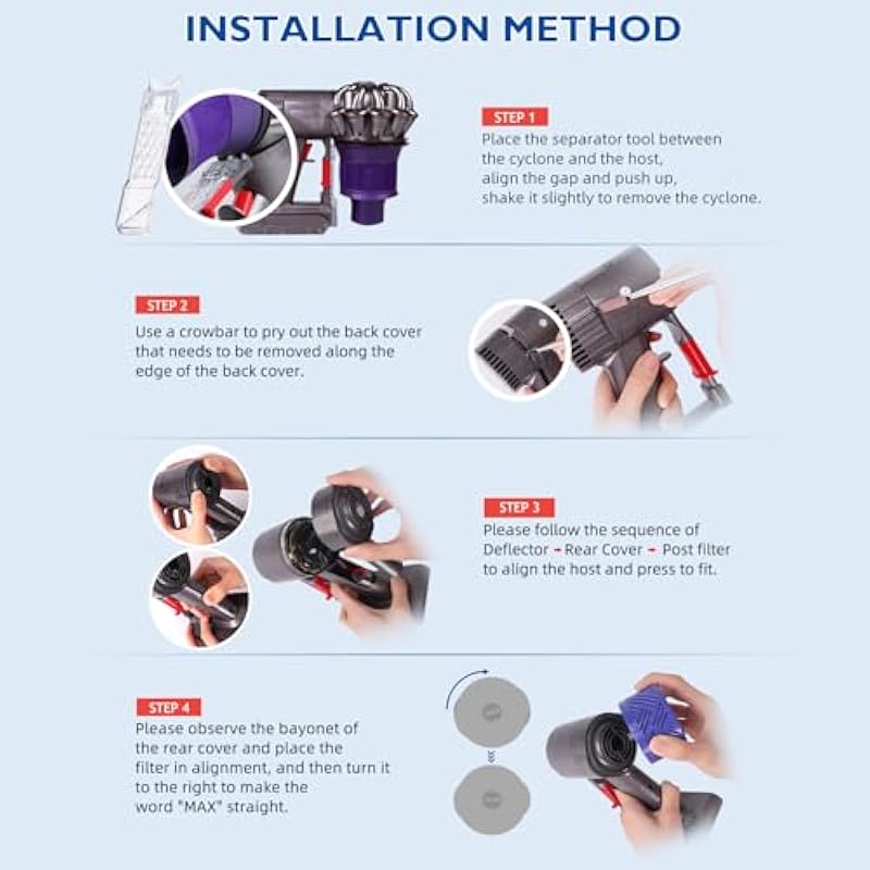 - Compatible Models: Compatible with Dyson V6 DC58 DC59 DC61 DC62 DC72 DC74 SV03 SV04 SV05 SV06 SV07 SV09 vacuum cleaner filter. Our v6 filter replacements part is inclued: v6 motor rear cover, v6 post filter. Extra auxiliary tool: separation bar, crowbar, end cap key and trigger Lock. Totally 6 pieces set