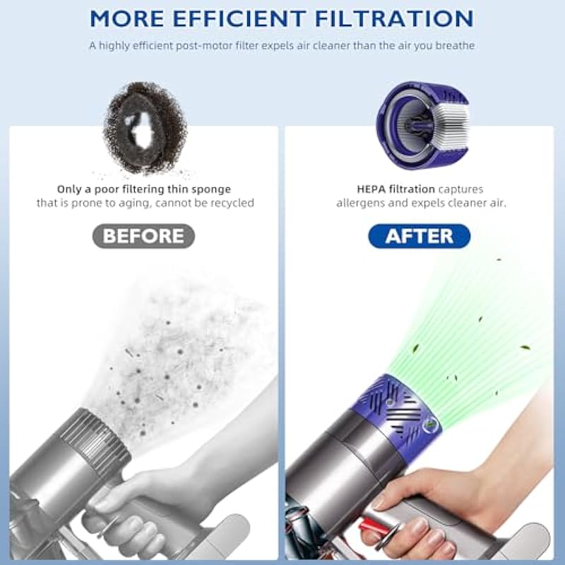 - Upgraded Filter Kit Effect: After replacing our V6 HEPA filter replacement and motor back cover replacement,high-quality made post HEPA filter could increase 3 times suction performance, also could wash for repectly use and could reduce the machine working noise