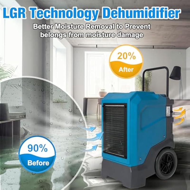 - High-Capacity Dehumidification: Removes up to 310 pints per day at saturation (165 PPD AHAM), ideal for basements, garages, job sites, and large restoration projects.