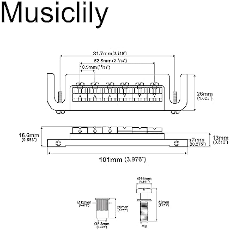 - String spacing: 52.5mm (2-1/16″), Spacing studs center to center: 81.7mm (3-7/32 “), Stud outside diameter: 12mm(15/32 “), Thread studs: M8, please check your guitar before you buy