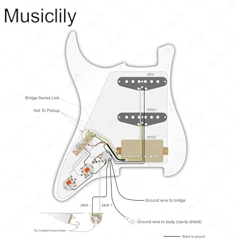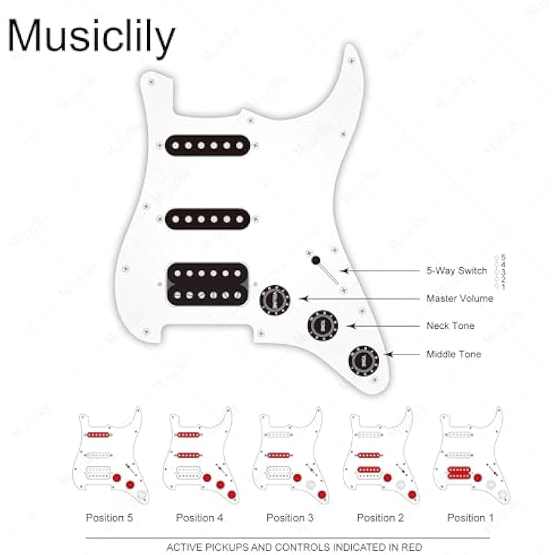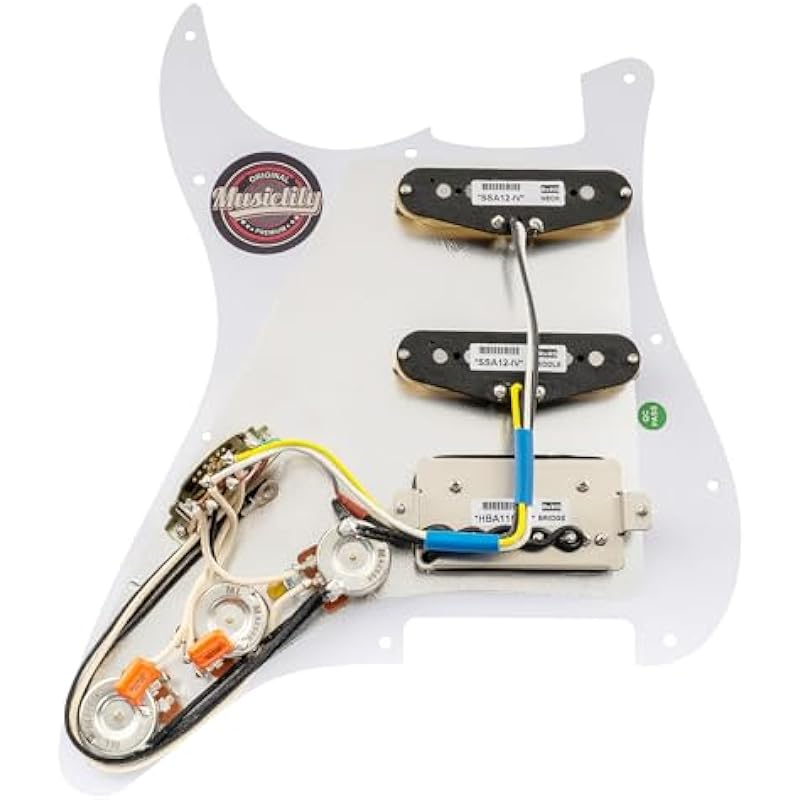 - Package includes: 1 piece pre-wired pickguard. Artec Pickups (Neck/Middle/Bridge): Resistance is 6.3K/6.5K/16.8K, Magnet: Alnico 5; Polepiece spacing: 50mm/52mm/52.5mm; Pots: Full Brass knurled shaft HD Series A250K x 3; Import Style Korea Made Heavy Duty 5-way switch and output jack; Orange Drop .022µF capacitor x 2 and Treble Bleed Mod; Vintage style push-back clothing wire