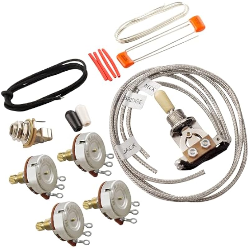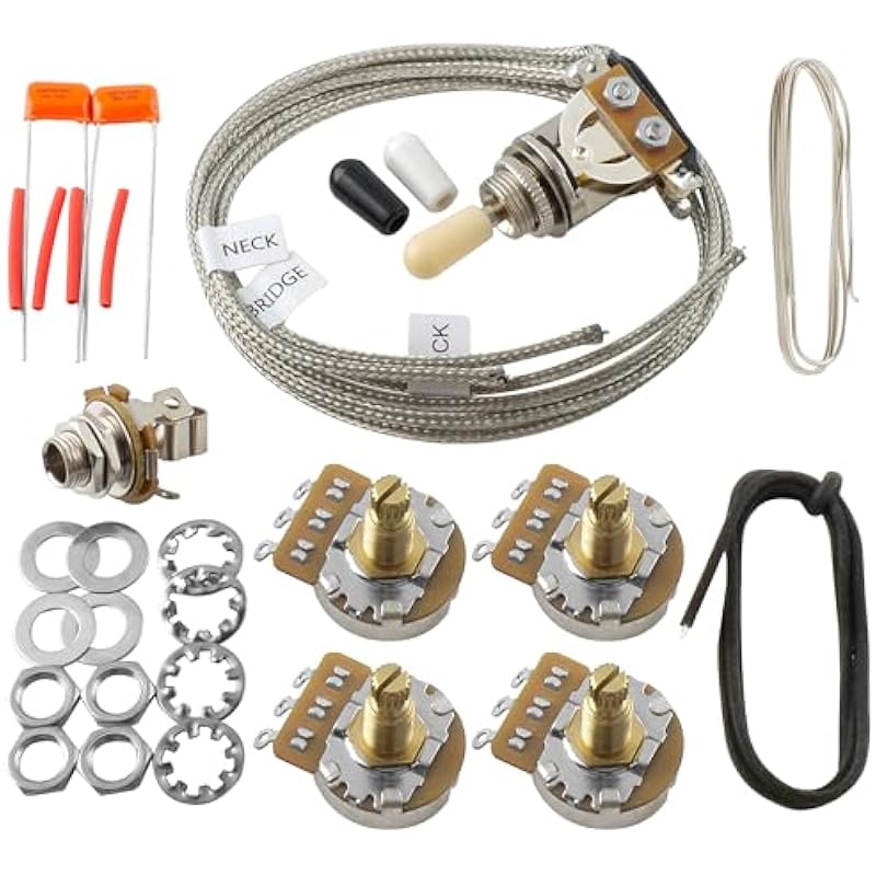 - Package includes: full set DIY wiring kit. (1) Switch: Pre-wired 3-way LP Style; (4) Pots: Full Brass Shaft HD Series A500K, Lower Torque (3/8″ Bushing Length); (2) Capacitor: .022uF Orange Drop; (1) Korea Made 6.35mm (1/4″) Output Jack; (1) Wire: 22 AWG Cotton Push Back w/ Tinned Overcoat; (1) Professional Wiring Diagram
