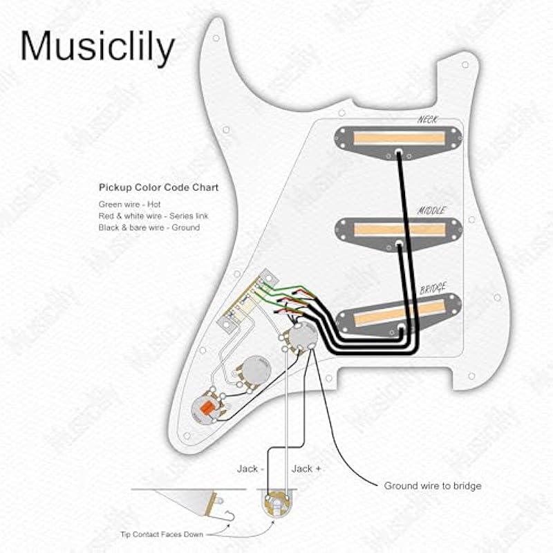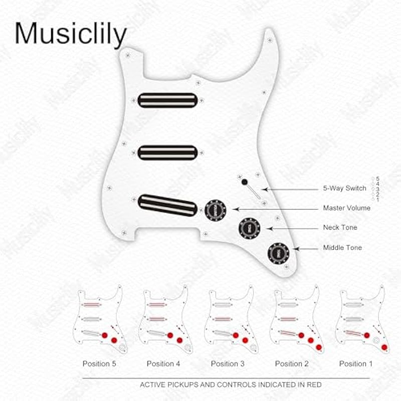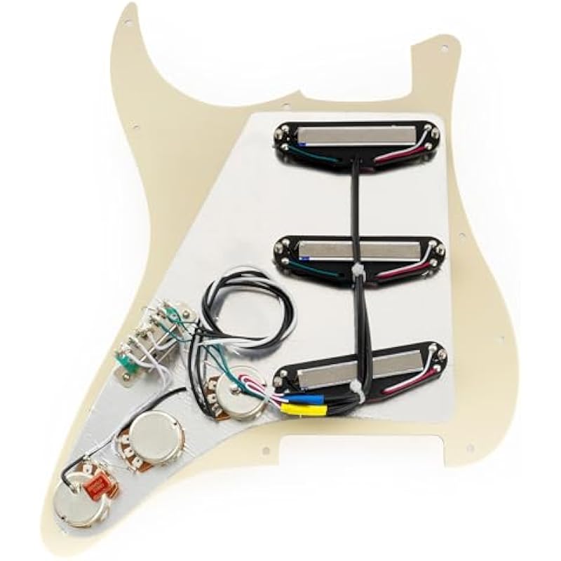 - Package includes: 1 piece of pre-wired pickguard. Pickups (Neck/Middle/Bridge): Resistance is 9.2K/9.2K/13.2K, tolerance: 1K, Magnet: Alnico 5, Rail length: 62mm; Pots: A500K(T) x 2+ B500K(V); Import style 5-way switch; .047uf capacitor; PVC wires