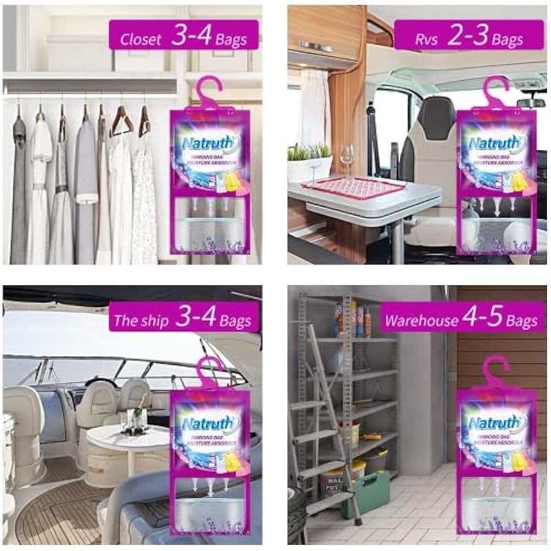 - 【HANGING DESIGN WITH MULTIPLE PURPOSES】: NATRUTH moisture absorber bags come with a hanging design and are perfect for dehumidifying various enclosed spaces like closets, bathrooms, kitchens, laundry rooms, RVs, boats, and basements. To use them, simply remove the package and hang it in your desired spot. The moisture absorber bags will create a dry and comfortable atmosphere in no time.