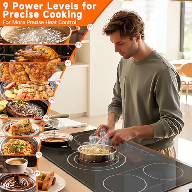 - 【9600W Powerful Electric Cooktop】This 36 inch electric cooktop delivers an impressive 9600W total power across five burners, ensuring quick and efficient cooking. With 9 adjustable heating levels, the 36″ elctric cooktop handles everything from simmering delicate sauces to boiling water rapidly.