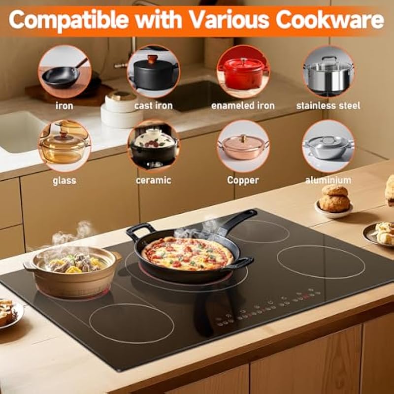 - 【Smart Safety Features for Peace of Mind】Cook with confidence thanks to built-in safety protections. The 220v electric stovetop includes child locks, overheating prevention, an automatic shut-off, and a hot surface indicator to keep your family safe. Compared to the workings of induction cooktop, this 5 burners electric ceramic cooktop has no radiation, ensuring peace of mind during every use.