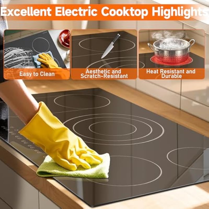 - 【Compatible with All Cookware&Easy to Clean】No matter your cookware—stainless steel, cast iron, aluminum, or copper—this 36 inch electric stove top handles it all with up to 70% heat transfer efficiency, speeding up your cooking time. Its smooth black glass surface not only looks stunning but cleans up in seconds with a simple wipe. For tougher messes, the included cleaning scraper makes maintenance a breeze, keeping your kitchen hassle-free.