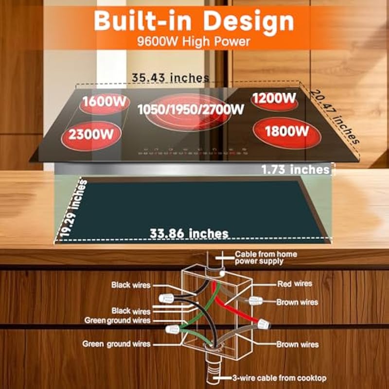 - 【Elegant and Space-Saving Design】Upgrade your kitchen with this sleek black ceramic glass cooktop, blending modern style with practicality. The sturdy, heat-resistant surface is effortless to clean, while its built-in design saves space and adds a refined, elegant touch to your cooking area. Measuring 35.43” x 20.47” (cut-out size: 33.86” x 19.3” x 1.73”), this 220-240V hardwired cooktop requires professional installation.