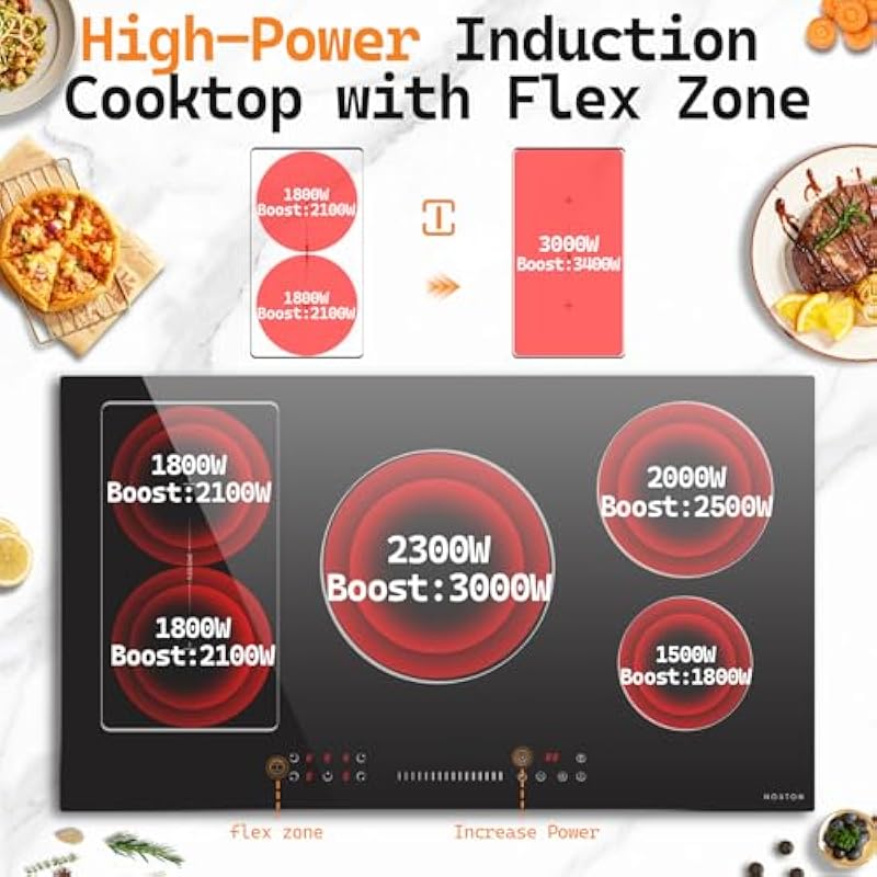 Noxton 36 Inch Induction Cooktop, 5 Burners Electric Cooktop, Upgraded Induction Stovetop with Flex Zone, Power Boost, Pause, 9 Power Levels, Child Safety Lock, Timer, 220-240V Hard wire