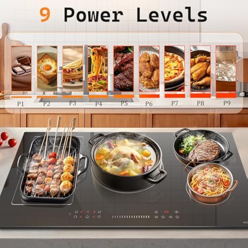 - 【Upgraded Sensor Touch and Drag Control】Noxton 5 burner electric cooktop is regulated by digital sensor touch technology that you can drag the slider to adjust the power and timer. This 36 inch induction cooktop, with its 1 – 9 level configurations, can satisfy the diverse temperature demands of different foods. It’s perfect for boiling, simmering, pan – frying, and stir – frying. This makes the cooking process straightforward and delightful.