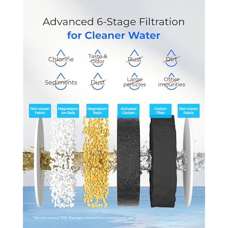- 6-Stage Filtration for Clean Water:With 6 advanced filtration stages, this Waterdrop filter reduces chlorine, odors, rust, dirt, sediments, and other impurities, providing clean, refreshing water without affecting TDS. Performance verified by a third-party lab.