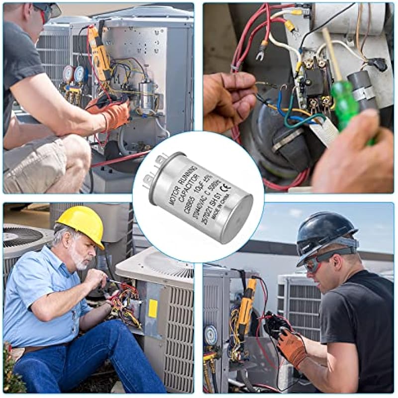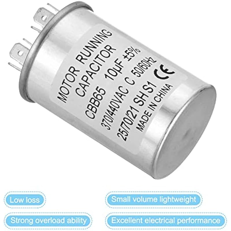 - Specification:Model: CBB65;Material: Metallized Polypropylene, Aluminum Case;Lead End: 2 Terminal(4+4pins);Rated Capacity: 10uf;Tolerance: ±5%;Rated Voltage: 370/440VAC;Rated Frequency: 50/60Hz;Climatic Category: 25/70/21;Overall Size: 40 x 60mm/1.56 x 2.34inch (D x H); Package Includes: 2Pcs x CBB65 Capacitor