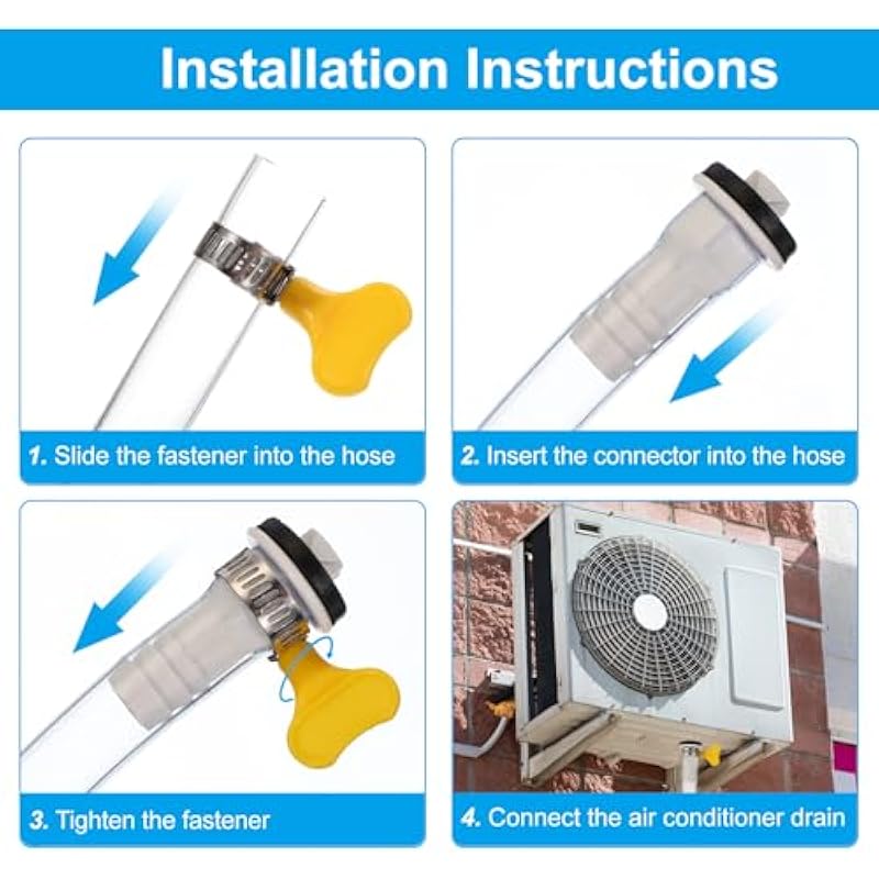 - Instruction: Easy to install, fix the drain connector to the drain outlet of AC, and connect the other end to the drain hose with the clamp.Fasten the hose to wall with the provided pipe straps and screws.