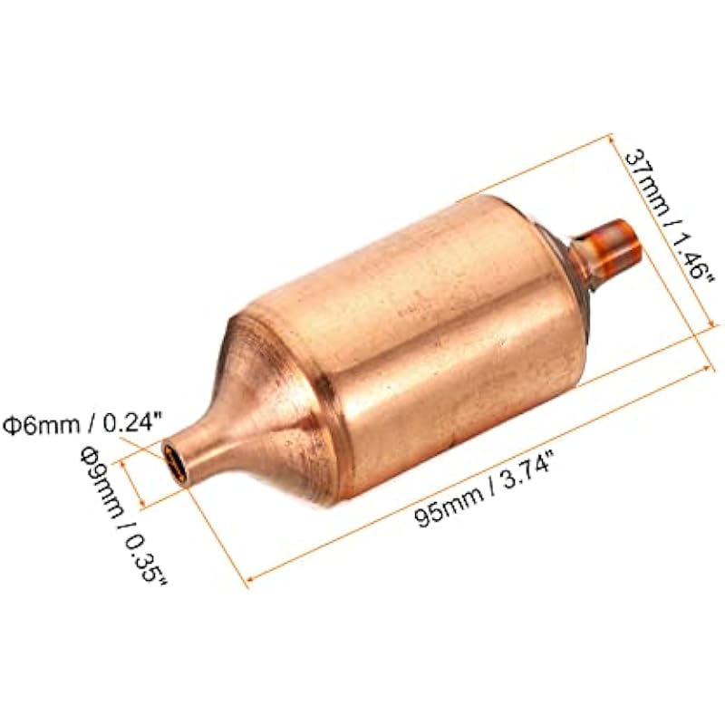 - Color: Copper; Material: Pure Copper; Connection Inner Diameter: 6mm / 0.24 inch; Connection Outer Diameter: 9mm / 0.35 inch; Total Size: 37 x 95mm / 1.46 x 3.74inch(OD*L); Package List: 1 x Filter Drier